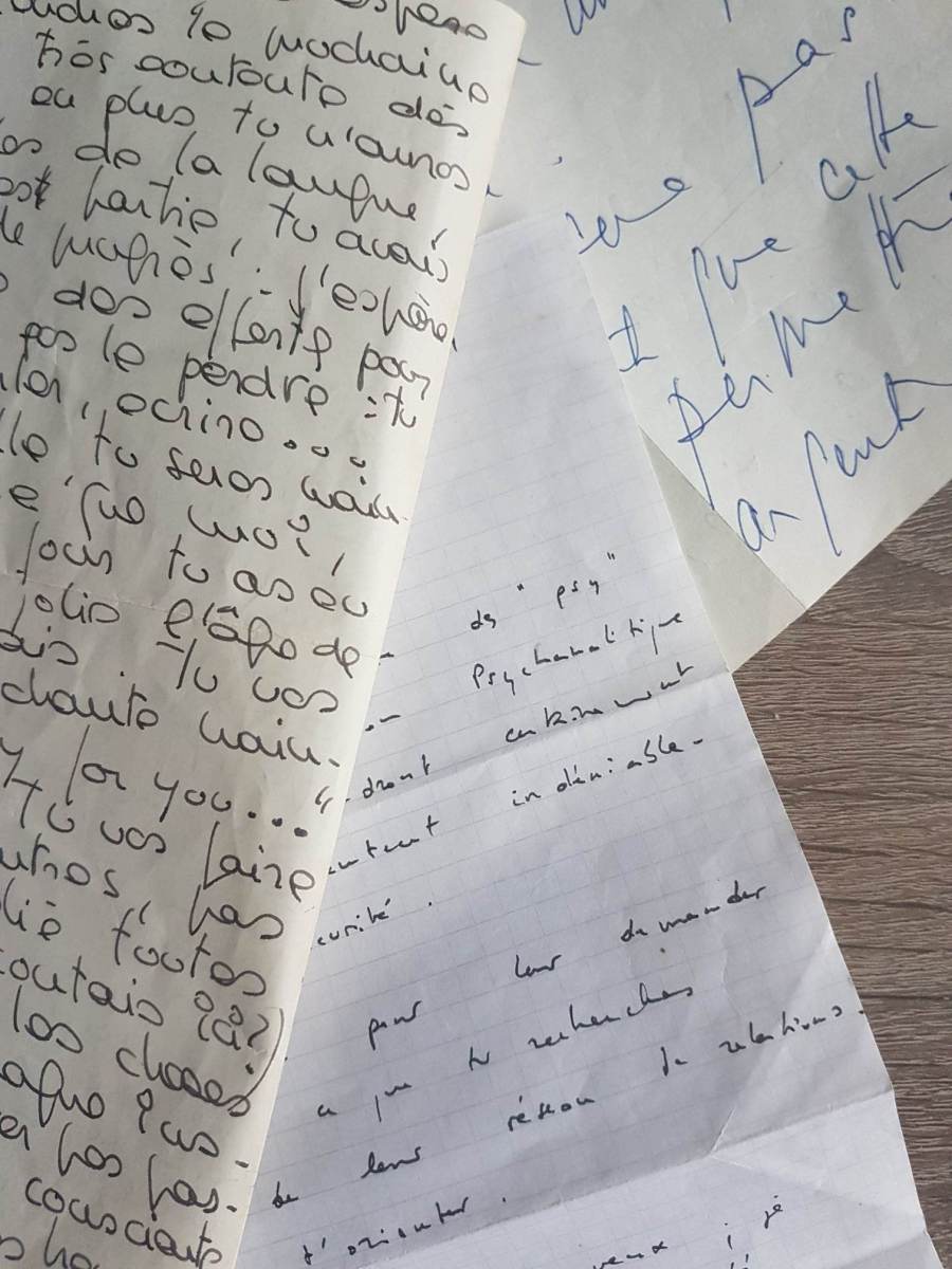 La deuxième au milieu est interrompue jusque dans les mots par l’espace laissé à l’autre, tellement grand qu’il permet de longues pauses avant l’expression d’un mot personnel, le scripteur s’effaçant presque totalement avec la petitesse de l’écriture également.